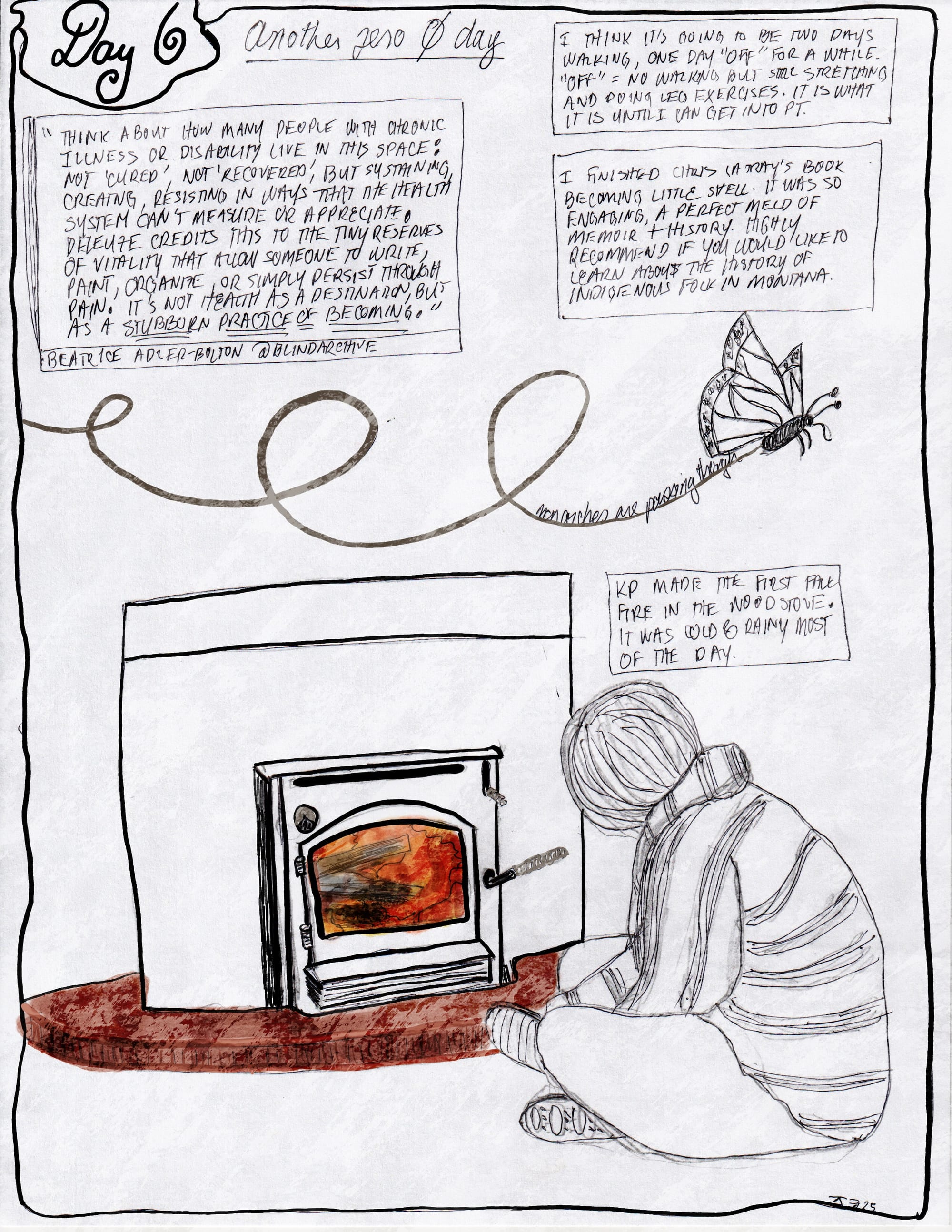 The bottom of the page is a line drawing of KP sitting on the floor in front of the wood stove with a fire roaring in the fire box.